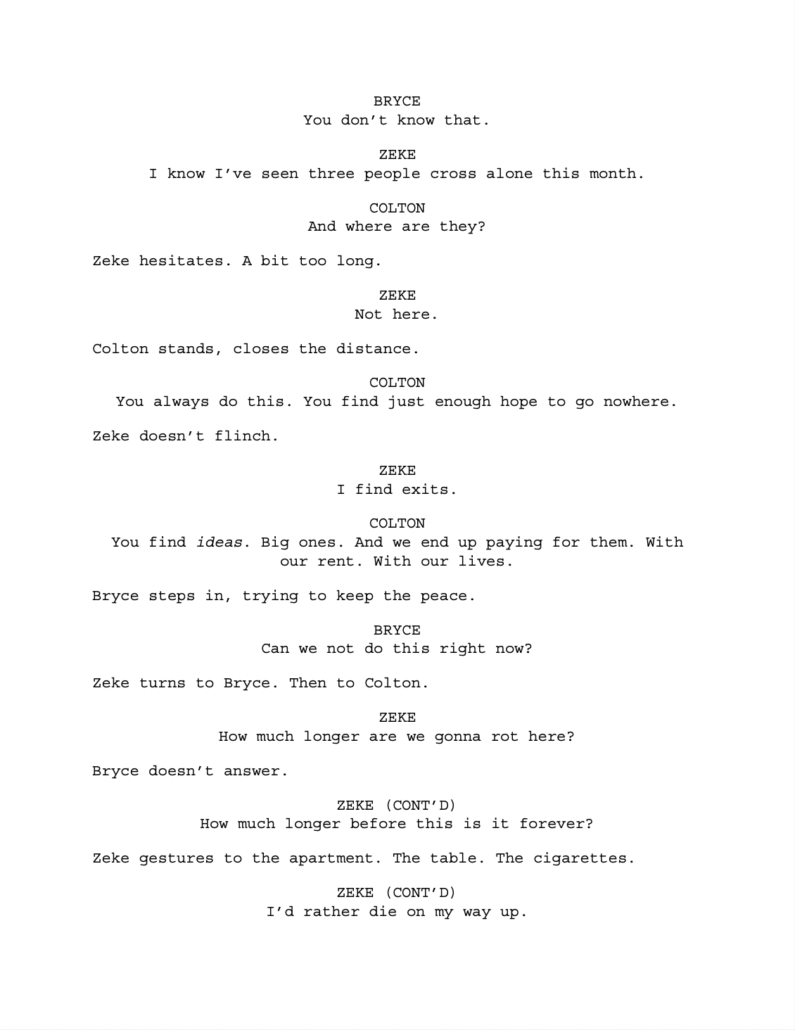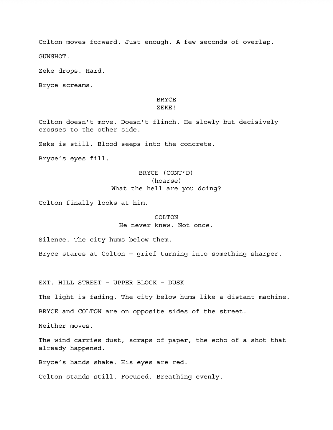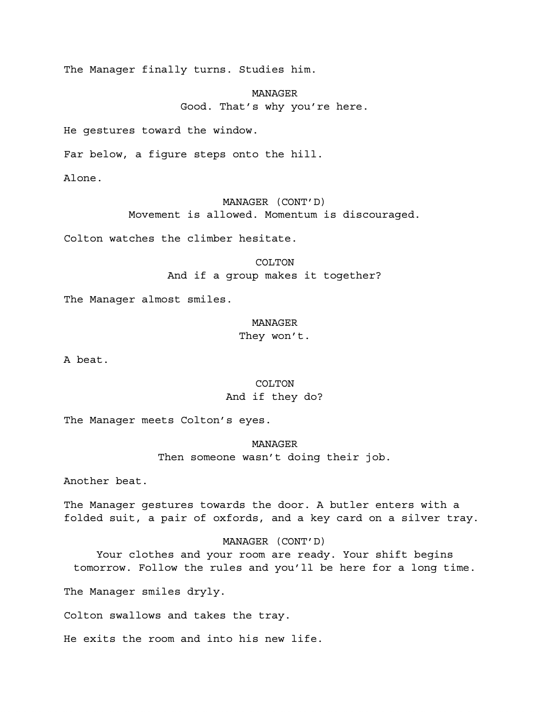 The story interrogates class mobility, scarcity, and the psychological effects of hierarchical class systems, where one person’s rise requires another’s fall. In its expanded form, Zero Sum deepens the emotional and ethical consequences of ambition, culminating in a final transformation after ascent that assimilates the protagonist within the very system he sought to escape. The accompanying script represents a foundational draft intended for further development into a standalone episode or feature-length film.