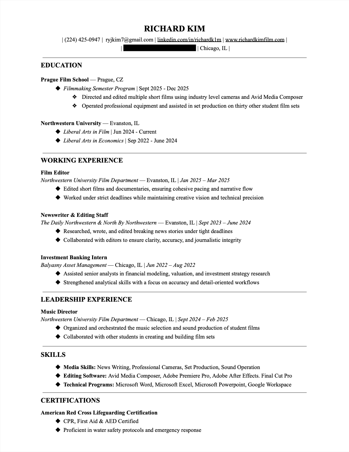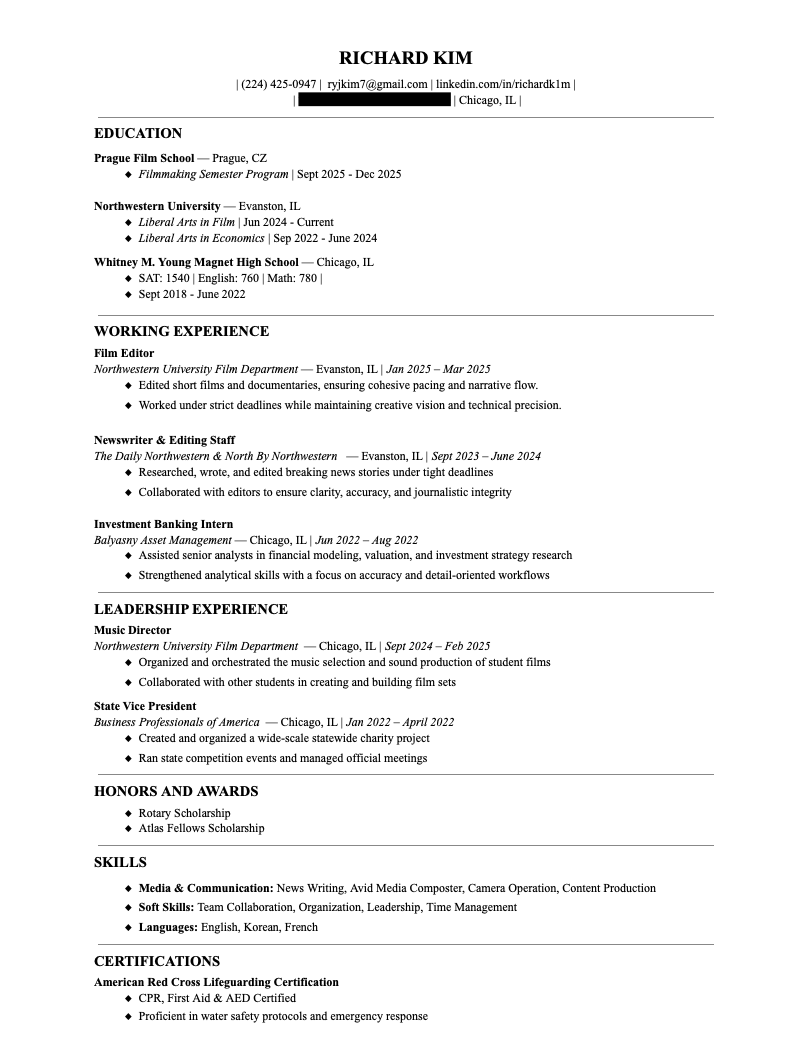 I’m currently a senior film major at Northwestern University and recently studied at Prague Film School, where I wrote and directed multiple short films. Alongside developing original narrative work, I’m focused on gaining hands-on experience in professional film and television production.